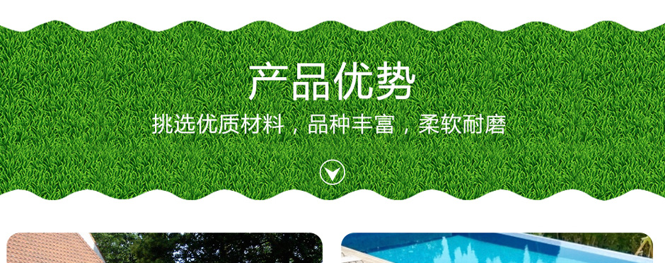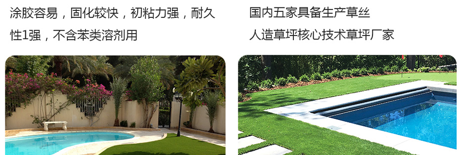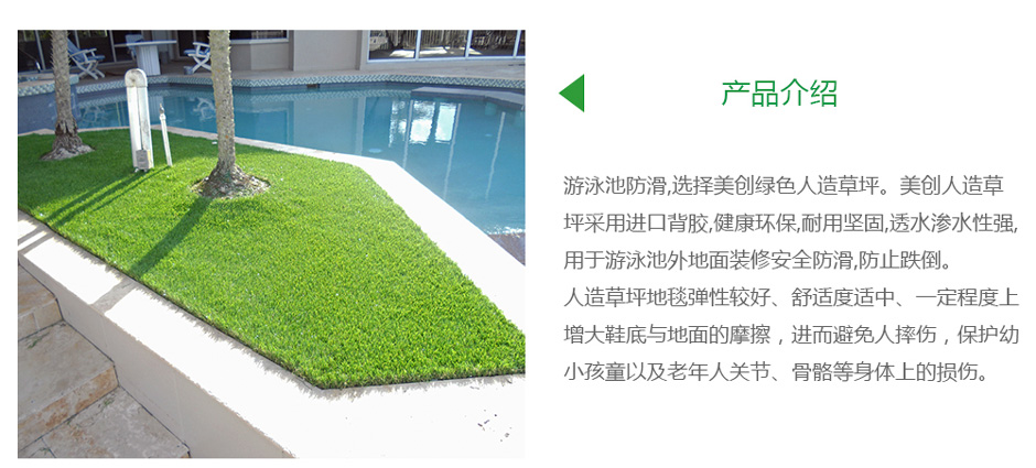 游泳池装修,游泳池地面材料,游泳池防滑,选择美创绿色人造草坪。美创人造草坪采用进口背胶,健康环保,耐用坚固,透水渗水性强,用于游泳池外地面装修安全防滑,防止跌倒。